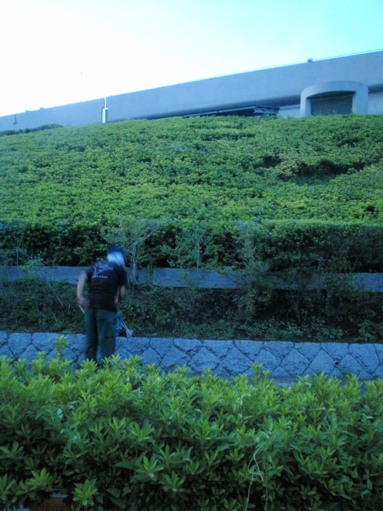 A handkerchief is wrapped around his head under the baseball cap to keep his back of the neck from the sunlight. He must have been out all day in this 35 degree Celsius Tokyo heat.